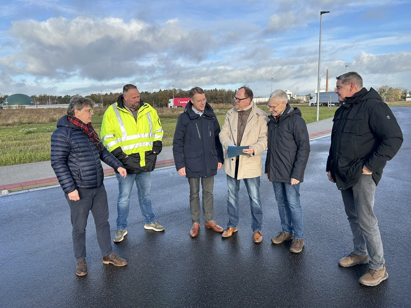 Gruppenfoto Samtgemeindeverwaltung, Ingenieure und Unternehmen bei der Abnahme zur Erschließung des Industriegebiets Hexenberg© Stadt Zeven