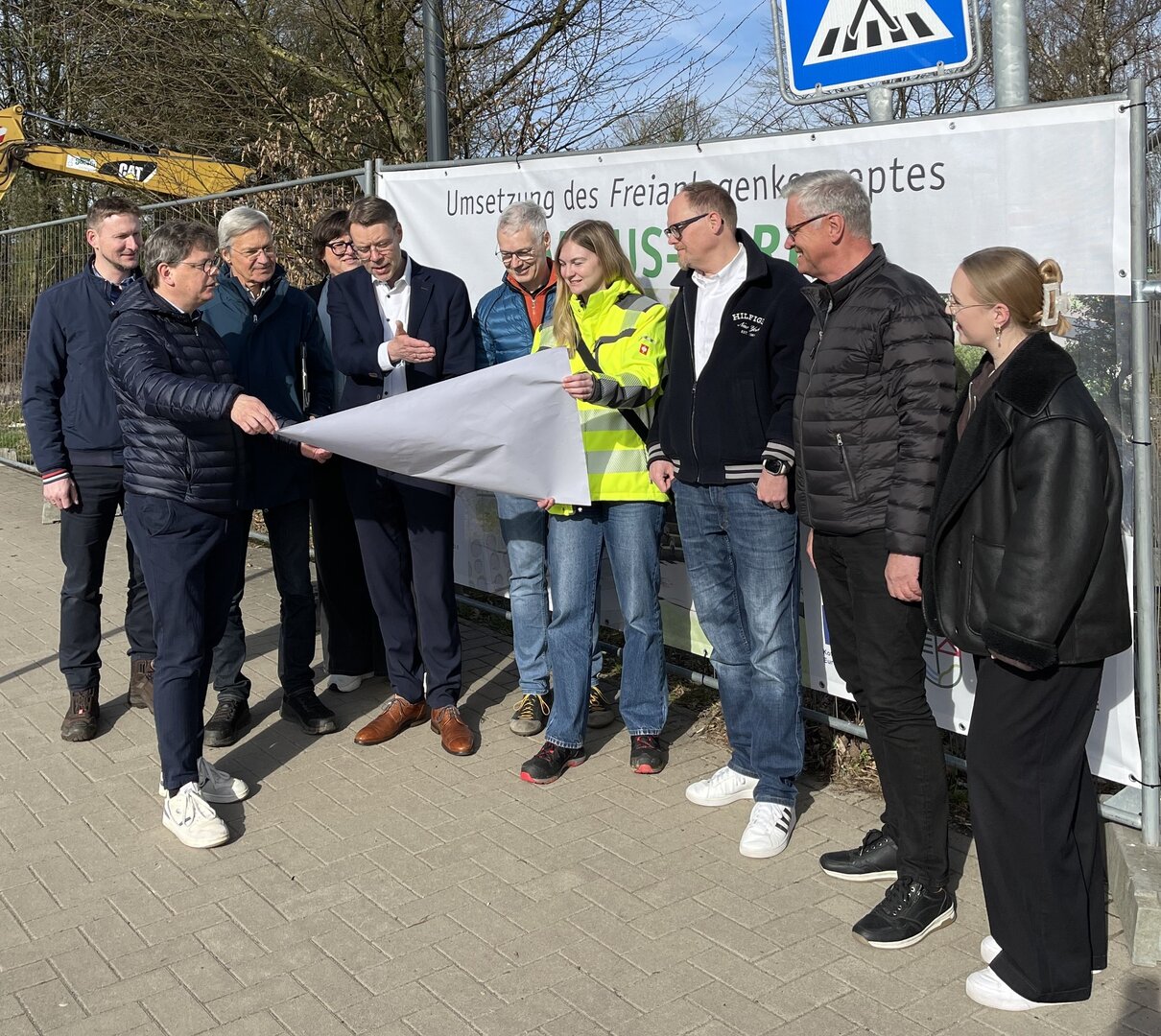 Anlässlich des Baustarts nahmen Landschaftsplaner Frank-Dieter Stucken gemeinsam mit den Bürgermeistern der Stadt, Jens Petersen, und der Samtgemeinde Zeven, Henning Fricke die Baumaßnahme in Augenschein. Anika Weber, Projektingenieurin in der Zevener Verwaltung, erläuterte den beteiligten Kolleginnen und Kollegen aus den Fachbereichen Bau, Planung, Umwelt, dem neuen und künftigen Schulamt sowie der Wirtschaftsförderung kurz die anstehenden Maßnahmen.