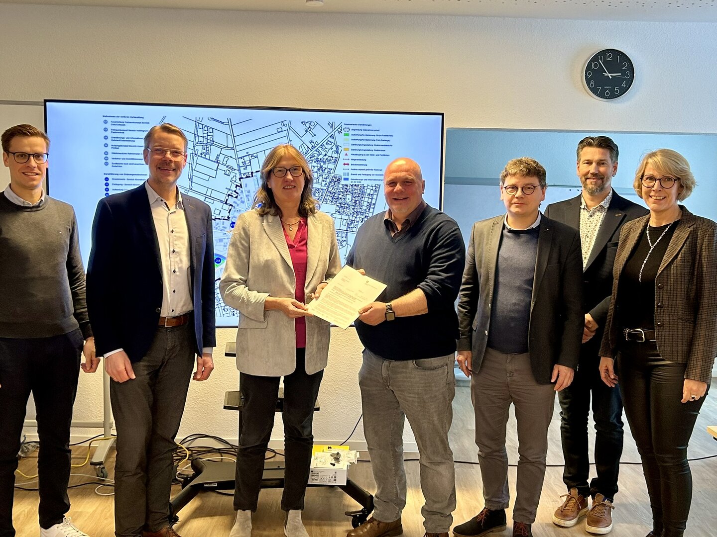 Bild: Karin Beckmann (2.v.l.), Landesbeauftragte des Amtes für regionale Landesentwicklung, übergab den Aufnahmebescheid an Bürgermeister Frank Braasch, Gemeindedirektor Henning Fricke im Beisein der Heeslinger Ortsbeauftragen Anja Förster und Dennis Meinders, sowie den Verwaltungsvertretern Christoph Schiemann, Städteplaner, sowie Christoph Reuther, Wirtschaftförderer, der Samtgemeinde Zeven © Gemeinde Heeslingen© Gemeinde Heeslingen