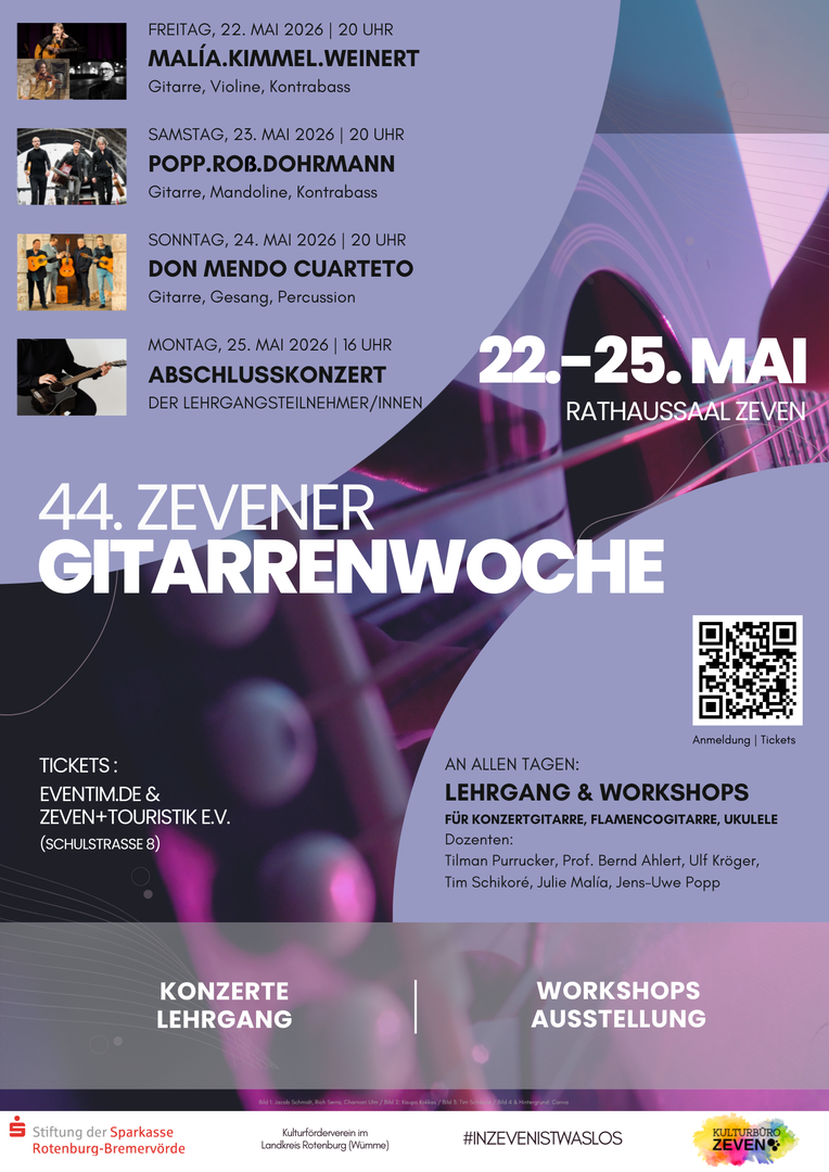 Plakat GIWO 2026© Stadt Zeven Vom 22. bis 25. Mai 2026 wird das Rathaus in Zeven wieder zum Treffpunkt für Musikfreunde. Dann findet die 44. Zevener Gitarrenwoche statt. Die Veranstaltung gilt seit vielen Jahren als fester Bestandteil im Kulturleben der Stadt.